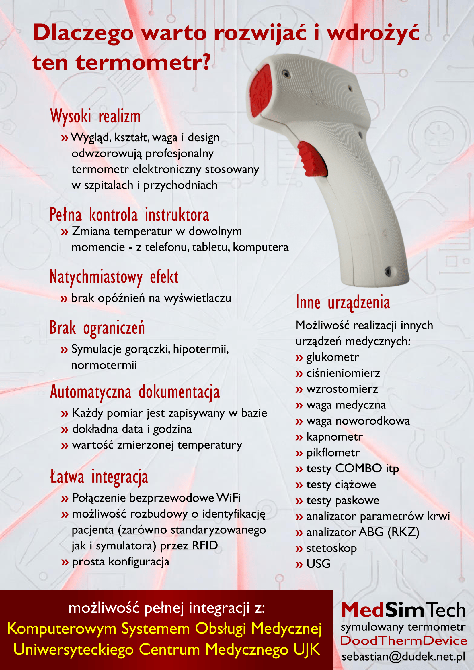 Dopełnieniem systemu UJKlides są symulowane urządzenia medyczne, które rozszerzają realizm prowadzonych zajęć. Powstał już w pełni funkcjonalny, działający prototyp termometru, a przyjęte podejście pozwala na tworzenie kolejnych urządzeń – zarówno pomiarowych i diagnostycznych, jak i terapeutycznych – dostosowanych do potrzeb konkretnych scenariuszy.